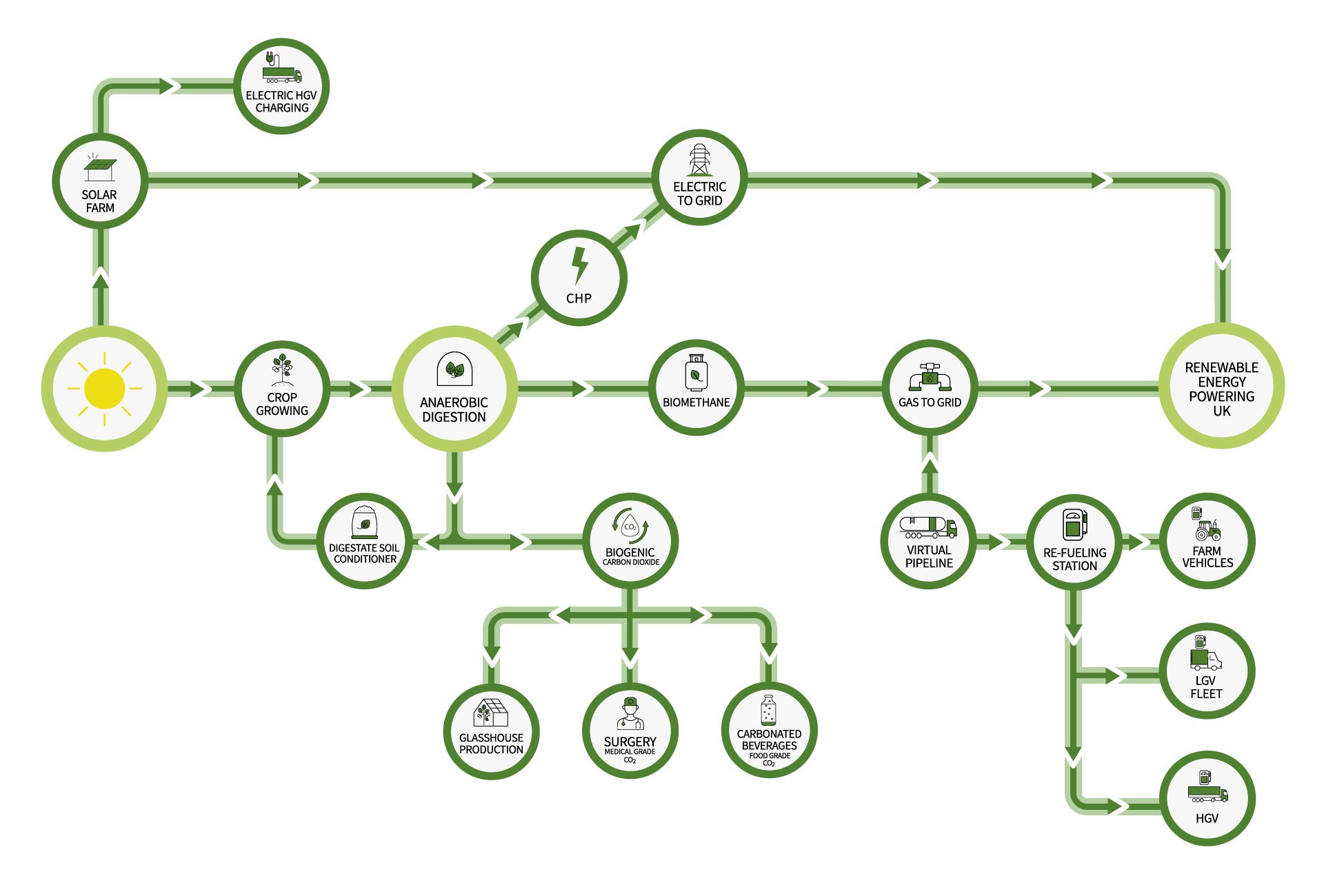 We have 2 Anaerobic Digestion plants, including a virtual pipeline, and a 19.35MW solar park. We pride ourselves in supplying green gas, electricity, biogenic carbon dioxide (that is food, beverage, and medicinal grade), and surplus heat to industry and local growers.